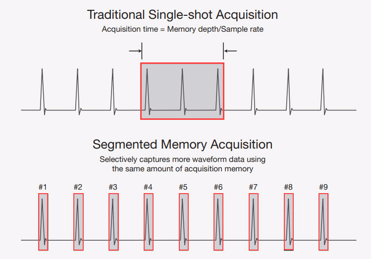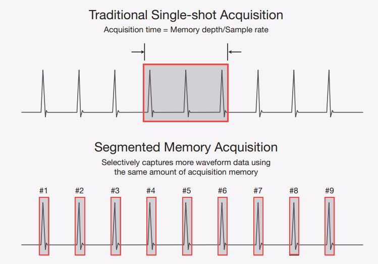 某些示波器具有一種特殊的操作模式,稱為“分段存儲器獲取”。分段存儲器可以從本質(zhì)上延長示波器的總采集時間。示波器通過將可用的采集存儲器劃分為較小的存儲器段來實現(xiàn)此目的,如圖8所示。然后,示波器以高采樣率選擇性地僅數(shù)字化被測波形的重要部分,并對每個段進行時間標記,以便您了解每次觸發(fā)事件之間的精確時間。此過程使您的示波器能夠以非??斓闹匦略O(shè)置時間捕獲許多連續(xù)的單次波形,而不會丟失重要的信號信息。當捕獲信號突發(fā)時,這種操作模式特別有用。突發(fā)類型信號的示例包括脈沖雷達,激光突發(fā)和分組串行總線信號。示波器分段存儲器在串行總線中的應用。即使這樣,Keysight示波器也可以在采集存儲器中進行升級,甚至可以在首次購買后數(shù)年內(nèi)進行更多升級,這意味著您可以立即購買所需的產(chǎn)品并在以后添加其他功能,而通常無需交付示波器即可使用。